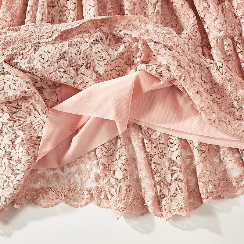 ネック・袖ぐり・裾はスカラップになっていて3段切替スカートもフェミニン!
