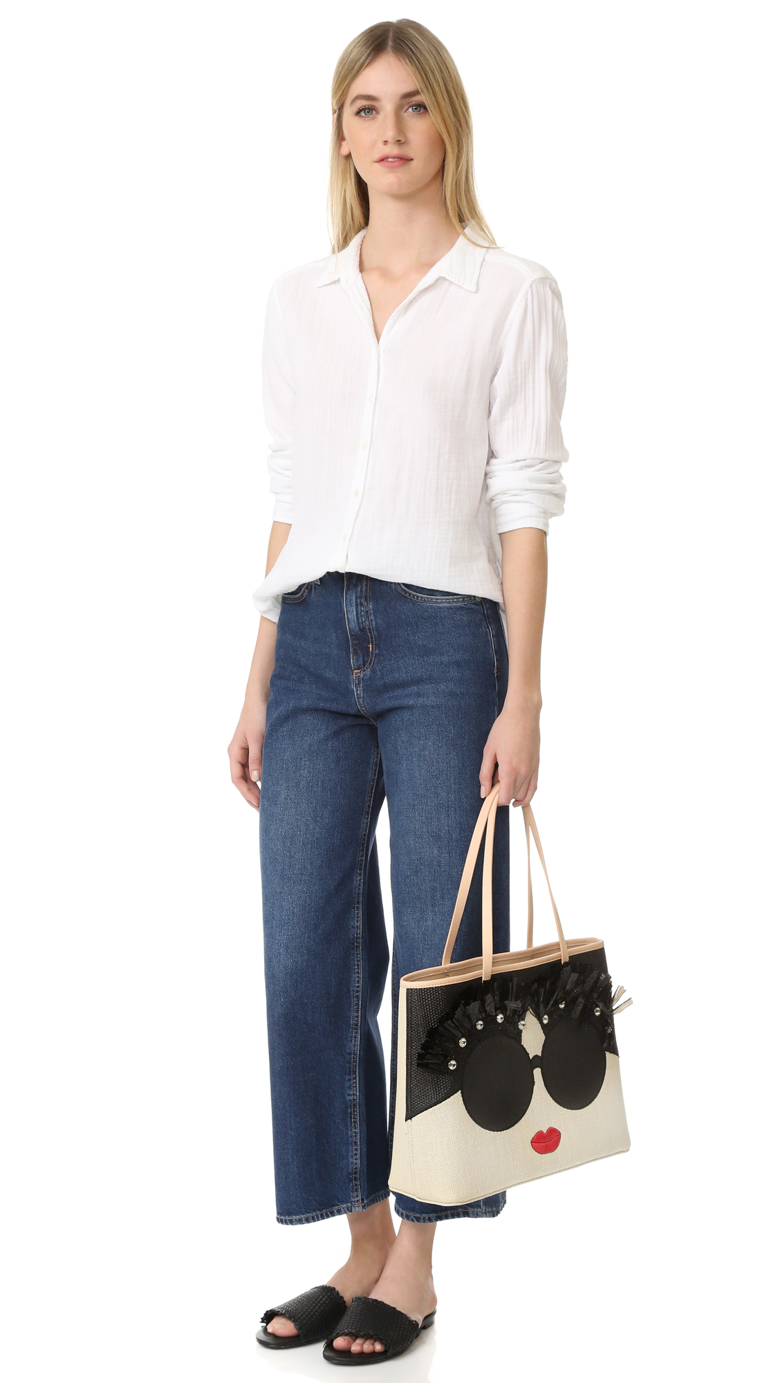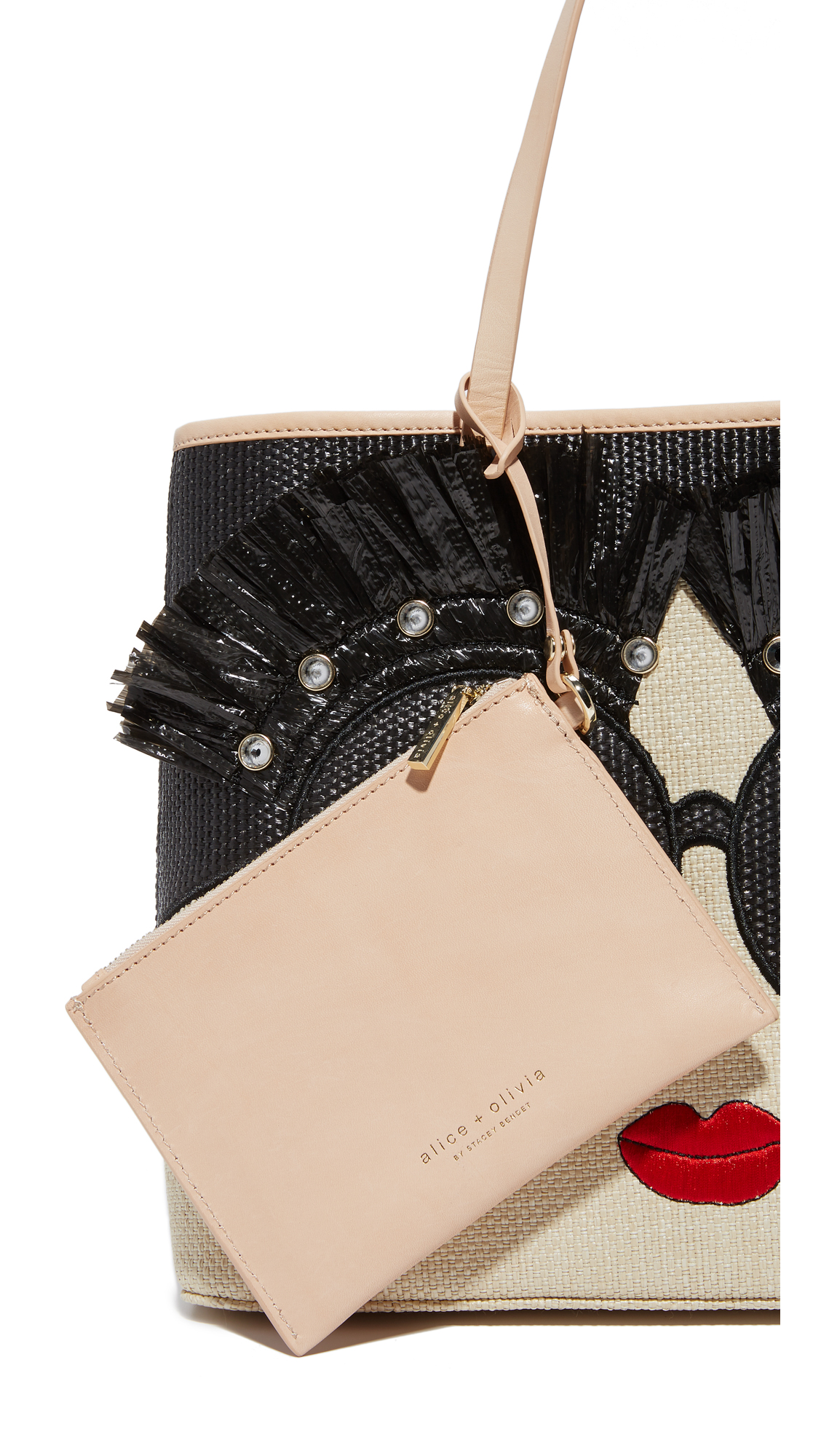 A signature face and glittering rhinestones detail this woven alice olivia tote. Leather interior with an optional zip pouch. Top handles.