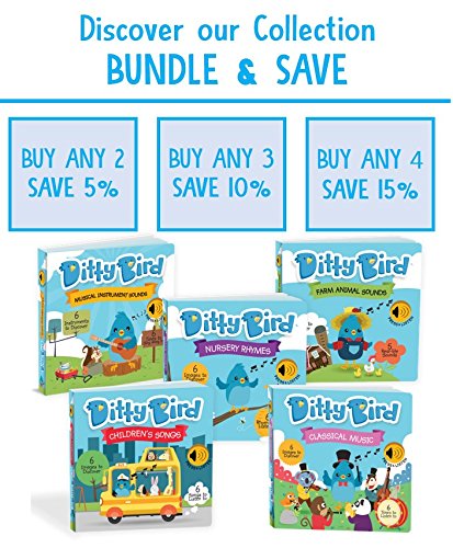 SING ALONG The Ditty Bird book series includes 5 beautifully illustrated singsong books for babies and toddlers ages 6 months to 3 years. Every interactive book features lovable, Ditty Bird, your little one's new best friend who loves to sing little ditties and invites all children to sing along while exploring dazzling pictures. EDUCATIONAL Easy and fun, Ditty Bird features a fantastic range of musical board books designed to appeal to inquisitive little fingers. Enjoy vibrant, colorful imagery on easy-to-turn pages while discovering classic children's songs with Ditty Bird leading the sing-along. DEVELOP SKILLS Each sound book features 6 images with 6 push buttons that play nursery rhymes, children's songs, classical music, farm animal sounds, or musical instrument sounds. Playing with the music buttons allows your child to have fun, be fully engaged with the illustrations, build early language and fine motor skills, and develop an appreciation for music. The books also help promote auditory development, giving children a head start for school. PERFECT GIFT Ditty Bird makes a perfect gift! New parents will cherish the time they spend bonding with their young ones while pushing the sound buttons and singing along to the sweet, classic tunes. Designed to be durable, these books are a great addition to every baby and kids book collection, and make ideal first books. - Ditty Bird Electronic Book Series - Push Buttons Play Children's Songs - Batteries includedFeature