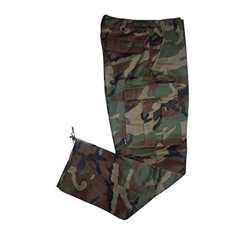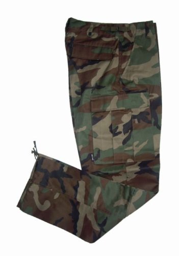 Product Description BDU combat trousers in Woodland. These trousers are made from a tough 65/35 polyester/cotton material. These combat cargo design trousers feature two front pockets, two rear pockets and two larger cargo-design pockets. They have a button fly with two adjustable waist straps on either side, reinforced seat and knees for added wear protection. Great outdoor trousers or street casual camouflage trousers. New, machine washable. 0