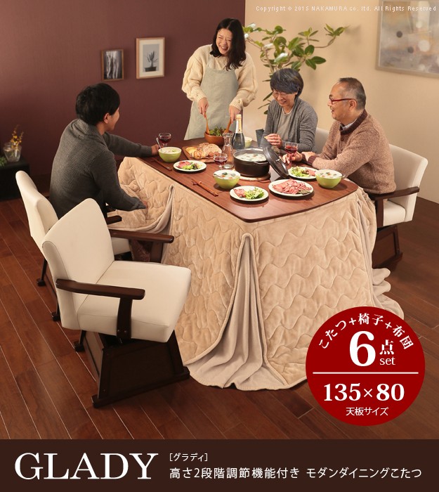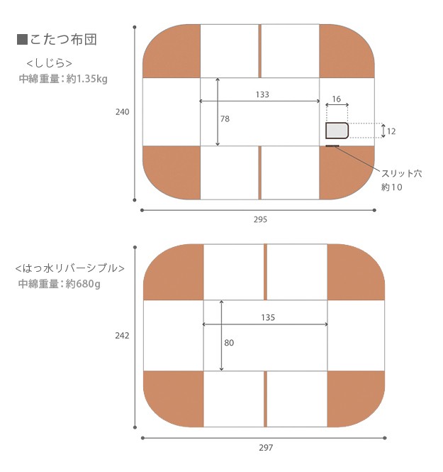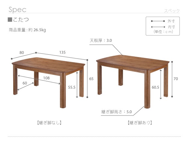 サイズ(cm):こたつ-幅135x奥行80x高さ70(65)・約26.5kg、椅子-幅57x奥行54x高さ72(67)・約10.5kg、布団-295x240cm