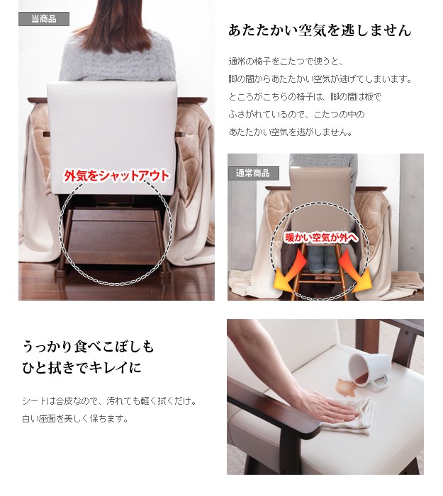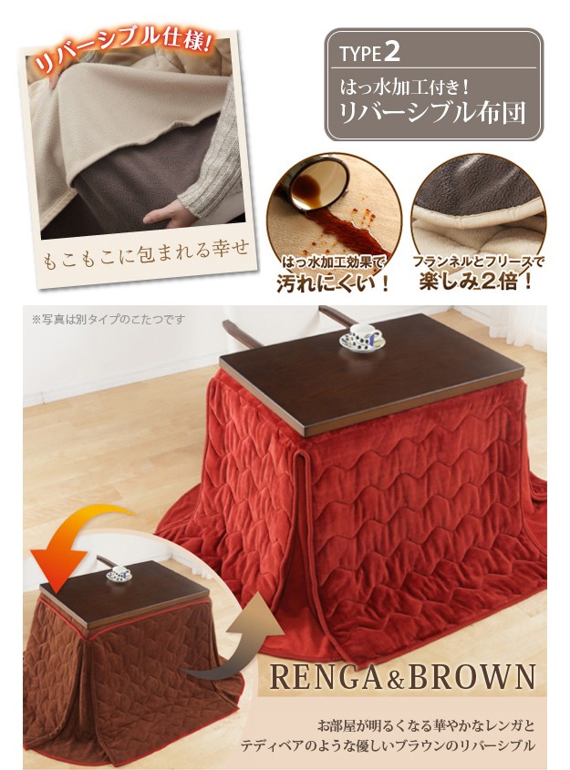 材質:こたつ天板-天然木化粧繊維板(ウォールナット)、幕板・脚部-天然木(ラバーウッド)、椅子本体-天然木(ラバーウッド)、布団表地-しじら/綿100%、レンガ・ベージュ/ポリエステル100%(撥水フランネル)