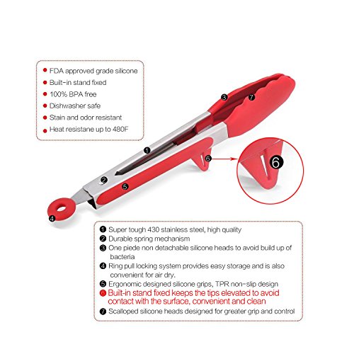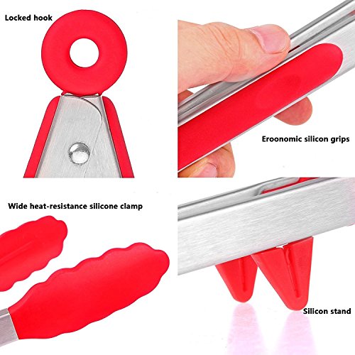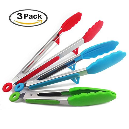 Package includes: - 1 × Silicone Tongs (Green 7" - handy for close control and ideal for small hands) - 1 × Cooking Tongs (Blue 9" - great all-rounder for cooking and serving) - 1 × BBQ Tongs (Red 12" - perfect for grilling to keep your hands away from the heat) √ Premium silicone is 100% FDA Grade and BPA Free. √ Heat resistant to 230F, and stain and odor resistant. √ Non-slip Surface design offer you the best control on food. √ Non-stick silicone tips is easy to clean and dishwasher safe. √ 7" 9"12"inch kitchen Tongs most meet your requirements indoor and outdoor. √ "O'"Ring design, convenient to locking and easy hanging. (Pull out to lock and push in to use)
