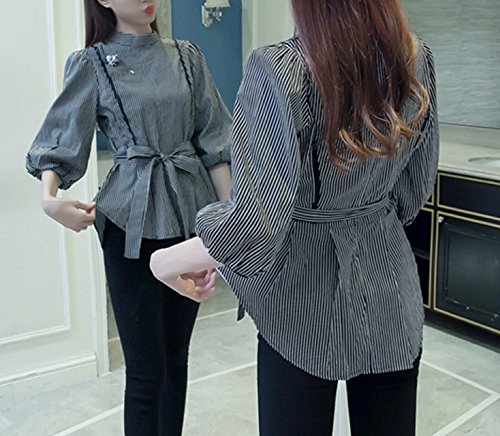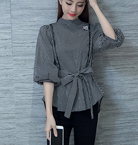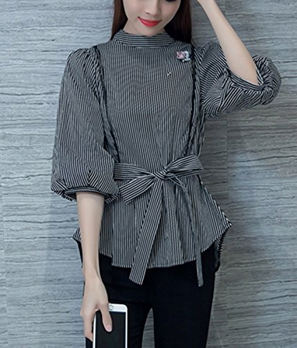 -. Feature : ウエストリボンが可愛い、爽やかなストライプのぺプラムデザインのブラウスです。縦のメッシュの切り替えが、スッキリしたきれいなボディラインを醸し出してくれます。スタンドカラー・後ろファスナー使いのデザインで、おしゃれなフォルムのブラウスとなっています。  / パンツにもスカートにもどちらにもよく合い、サンダルやフラット・ぺたんこシューズに合わせて頂くとキュートなかわいい雰囲気になり、ガウチョパンツやワイドパンツ、パンプス、ハイヒールなどに合わせて頂ければ、大人可愛いコーデが完成。ボトムスを選ばないので様々なコーデを楽しんで頂けるお薦めのアイテムです。  / 【カラー】黒【素材】コットン・ポリエステル  ※ブローチが付いています。 / 【サイズ】M サイズ、Lサイズ、XLサイズ / ストライプ柄の、清楚できれいな印象の長袖ブラウスなので、通勤 オフィス ウェアとして、学校行事 参観やお出掛けまで、様々なシチュエーションで活躍する定番アイテムとしていかがでしょうか。カラーは人気のブラック ホワイト ストライプ。春・夏は1枚で!秋、冬にはやアウター合わせて頂くと幅広いコーデを楽しんで頂く事が出来ます。テロンチ トレンチ コートやジャケットとも合わせて頂いたり、様々なシーンに活躍できる1枚です。