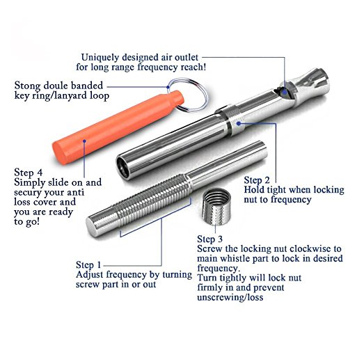 Studio : Pety Pet Publisher : Pety Pet Binding : Misc. Product Description We have tested this whistle on many dogs and the results were amazing! It sounds hype? It surely does, but only if you stick to the instructions we provide with the whistle.We guarantee that you will see the great results this amazing tool can help you achieve. You have to remember that this is a tool, and no tool is good in the hands of those, who are not willing to master it. Instructions 1. Adjust the pitch blow the whistle to your dog. Follow the steps in the fourth picture.You may want to wait until he is asleep and gently blow on the whistle. 2.Testing until your dog perks up. You will then know you have reached a frequency he can hear. 3. Use the dog whistle with varying sequences to train your dog. For example, one long burst can mean "come", while a series of short, staccato bursts might mean "sit". 4.Keep your whistle commands consistent and your dog will always know what you expect of him. Change your dog's behavior through training. For instance, at meal time, blow on the whistle before they get the food. It will only take a few attempts doing this before your dog gets good at it. 0