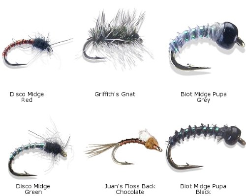 -. Feature : Midge flies from Montana Fly Company / 12 flies = 2x griffiths gnat #18 (dry flies), 2x Juan's Floss back - chocolate #18, 2x disco midge red #18, 2x biot midge - Gray #18, 2x midge biot pupa black #20, 2x disco midge green #18 / The flies are packed in a 6 compartment plastic fly box
