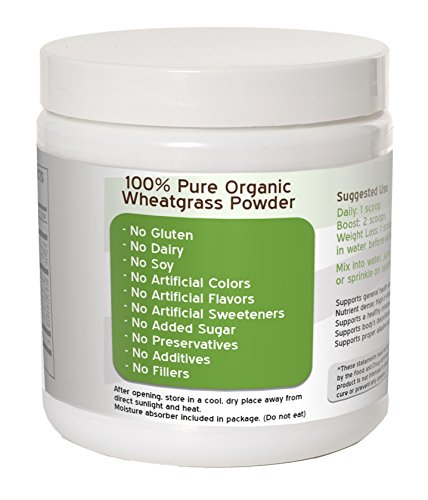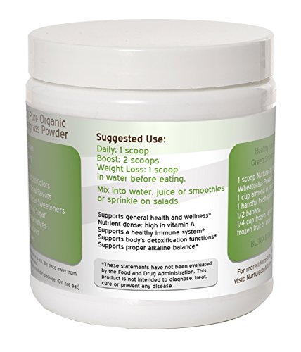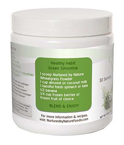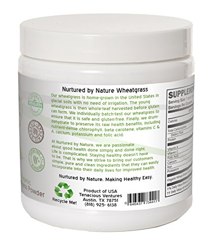 -. Binding : Health and Beauty -. Brand : Nurtured by Nature Foods -. EAN : 0646437734417 -. Feature : HOW WE'RE DIFFERENT: Unlike many wheatgrass powders available, Nurtured by Nature is 100% pure, single ingredient, organic, USA grown by American farmers. Our delicious wheatgrass is batch-tested for common allergens and other impurities. Our wheatgrass is nutrient-dense in chlorophyll, beta-carotene, vitamins C and A, potassium and folic acid. / USA-GROWN: We source our quality wheatgrass from United States farms and never import it. While some companies are able to offer reduced prices, the savings must come from somewhere and lower quality, Chinese imported wheatgrass is more common than we care to think about! Our 100% organic, non-GMO, USA-grown wheatgrass is produced at higher standards and our quality and value set us apart. / ALLERGEN BATCH-TESTED: Our wheatgrass is third-party batch-tested for gluten, soy and dairy, three of the most common allergens. So those of you with sensitivities, allergies or intolerances can be assured that you are getting only pure allergen-free wheatgrass powder in its perfect form. / OUR MISSION: At Nurtured by Nature we're passionate about good health done simply and done right. A small American business of real people like you, we support organic farming, the Non-GMO Project and the movement to make food better and more transparent. What goes on your plate and in your bellies is what fuels you and your family to live your best life every day. It is our mission to ensure that our ingredients and our actions support exactly that. / OUR PROMISE: Nurtured by Nature offers complete customer satisfaction, period. Our customers are more important than our sales. If for any reason you are not absolutely happy with your wheatgrass superfood powder, we will replace or refund your order, no questions asked. CONTACT US BEFORE YOU CONTACT AMAZON and we will take care of you! Feel free to reach out at any time for questions or comments. Or even to ask for tips and recipes. We love to help! -. IsAdultProduct : 0 -. Label : Nurtured by Nature Foods -. Manufacturer : Nurtured by Nature Foods -. MPN : WG1 -. PackageQuantity : 1 -. PartNumber : WG1 -. ProductGroup : Health and Beauty -. ProductTypeName : HEALTH_PERSONAL_CARE -. Publisher : Nurtured by Nature Foods -. Studio : Nurtured by Nature Foods -. Title : Pure Organic Wheatgrass Powder, USA grown, Non-GMO, Gluten-Free, Soy-Free, Dairy-Free, Vegan, by Nurtured by Nature, 30 Servings -. UPC : 646437734417