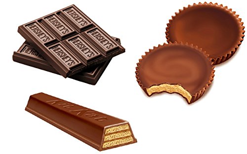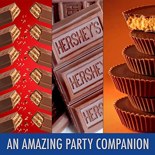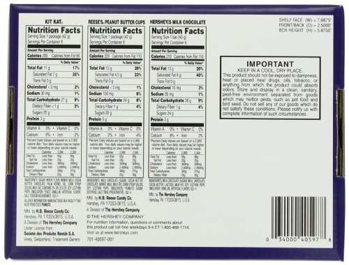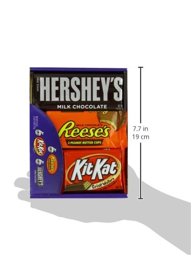 Item Description All of your favorite Hershey's Chocolate bars are here in one package. The assortment includes Hershey's Milk Chocolate bars, Reese's Peanut Butter Cups and Kit Kat bars. Whether you like smooth or crunchy, peanut butter or cookies, this assortment has a little something for everyone. The full-sized chocolate bars are individually wrapped and perfect for sharing. Features One 18-count variety pack of Hershey's Milk Chocolate, Reese's Peanut Butter Cups, and Kit Kat bars Reese's full-size candy bars The creamy taste of HERSHEY'S Milk Chocolate Bars The perfect combination of peanut butter and milk chocolate with REESE'S Peanut Butter Cups The delicious combination of smooth milk chocolate and light, crispy wafers of KIT KAT Six full-size bars of each candy bar Brand - Hershey'sFeature