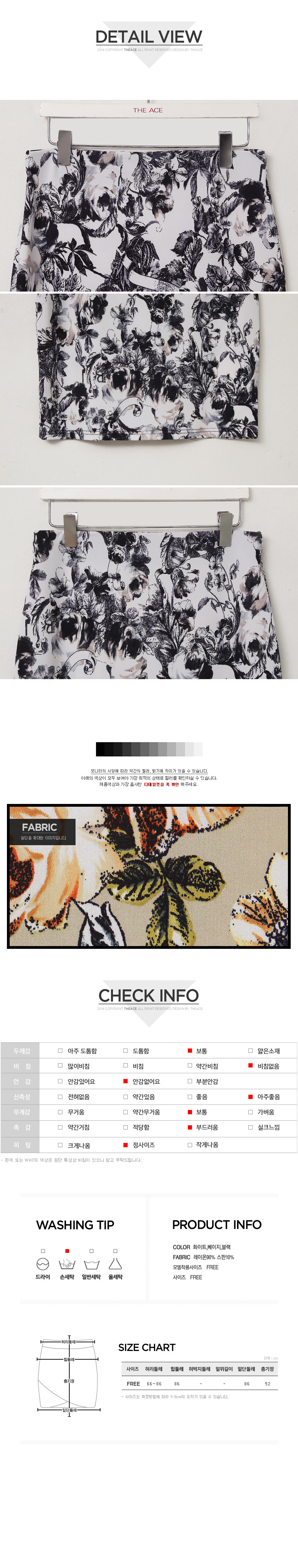 1. 밴딩으로 허리는 편하게~ 듬뿍담긴 플라워 패턴으로 화사하게~ 2. 레이온과 스판 혼방이라 부드러운 텐션감이 좋구요 3. 허벅지 중간정도 오는 부담없는 기장이라 상의를 빼내어 입어도 플라워 포인트를 주기에도 예쁘고, 과하지 않은 패턴이라 페미닌한 룩을 선사해드려요 4. 색상은 화이트, 베이지, 블랙 세 가지 컬러로 진행. 5. 사이즈는 55~66반까지 착용 가능하답니다.