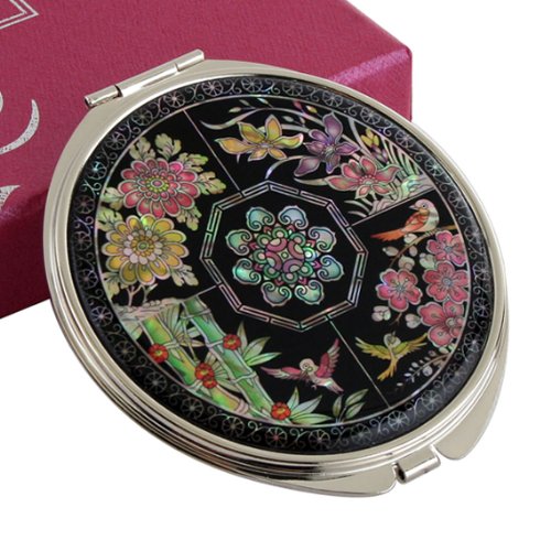 Mother of Pearl Four Noble Plants Double Compact Magnifying Cosmetic Makeup Purse Pocket Mirror, 3.2 Ounce