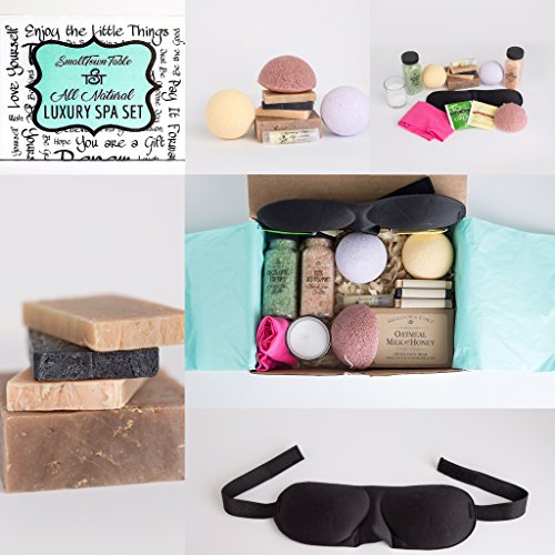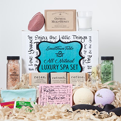 Spa Kit Fun The Ultimate Spa Package for anyone in your life. *RELAX*REFRESH*RENEW* This kit includes all SmallTown Table natural gorgeous bath products all in one amazing package. Each Spa Gift box contains 2 Bath Bombs, A full size bar of our most popular soap Oatmeal Goat's Milk and Honey, 3 handmade travel soaps: Charcoal, Fig and Lemon, 2 All Natural Pure Bath Salts: A trending Konjac sponge-dermatologist recommended, Organic Lip Balm, a cute soft Headband, Votive and even Tea to drink. Bathbombs are All Natural- ZERO cornstarch! Our small family business strives every day to provide quality products. Just opening the box brings a smile. Bring the spa to you! We share smiles, one care package at a time.Feature