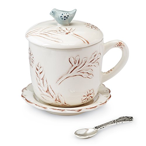 -. Binding : Kitchen -. Brand : Mud Pie -. Color : White/Blue -. EAN : 0718540386453 -. Feature : Ceramic tea cup features debossed hand-painted BRANCH icons and comes with removable lid with hand-painted bird icon topper / Cup and lid rest on saucer with scallop trim detail. Set arrives tied with silver plate stirring Spoon / Saucer is 4.5" diameter; Spoon is 5" long; cup holds 12 ounces; lid is 4" diameter / Hand washing is recommended -. Label : Mud Pie -. Manufacturer : Mud Pie -. Model : 4354024 -. MPN : 4354024 -. PackageQuantity : 1 -. PartNumber : 4354024 -. ProductGroup : Kitchen -. ProductTypeName : KITCHEN -. Publisher : Mud Pie -. Size : 4 x 5 -. Studio : Mud Pie -. Title : Mud Pie Tea for One Set, White/Blue -. UPC : 718540386453