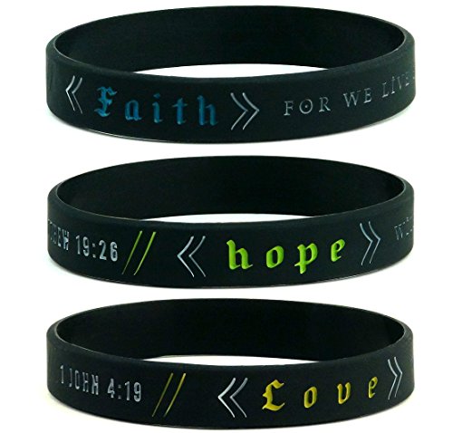 -. Feature : Set of 6 "Faith, Hope, & Love" silicone bracelets, engraved with Bible verses / Standard adult size of 8" around; Classic unisex design is suitable for both men and women / "FAITH" - For we live by faith not by sight. - 2 CORINTHIANS 5:7 / "HOPE" - With God all things are possible. - MATTHEW 19:26 / "LOVE" - We love because he first loved us. - 1 JOHN 4:19
