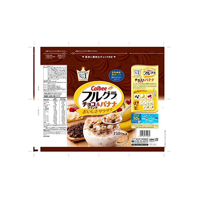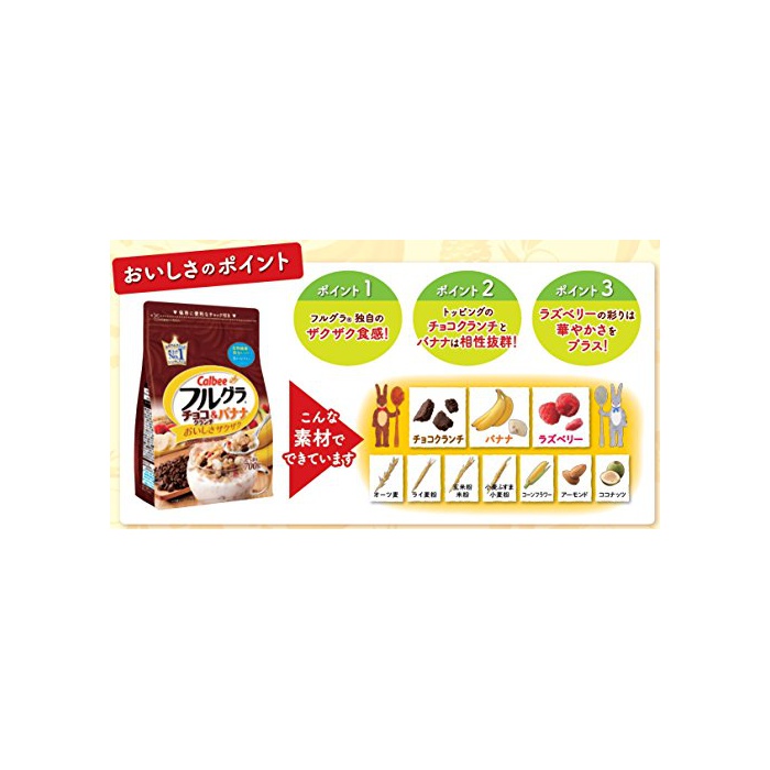 원재료:O《즈》맥,호밀분,설탕,소맥분,초콜렛 crunch(소맥분,설탕,쇼트닝,코코아 파우더,탈지분유,식염)고, 코코넛,말《도데키스토린》,식물성 기름,미분,수용성 음식물 섬유,콘 플라워,건조 바나나,《라즈베리》가공품,아몬드,식염,밀 # 해결되고, 현미분/가공 전분,구연산철Na,유화 제(대두를 포함한다)고, 신맛료,셀룰로오스,착색료(카라멜,앤《도시아닌》)고, 산화 방지제(비타민E)고, 나이아신,팽창 제,구연산Na,판토텐산Ca,향료,비타민A,비타민B6,비타민B1,엽산,비타민D,비타민B12