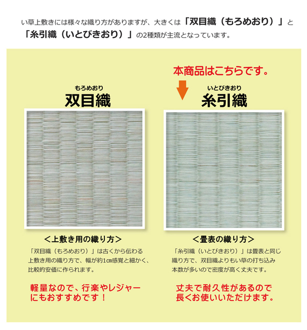 上敷きを敷くだけで畳のお部屋をリフレッシュ出来ます。日焼けしてしまった畳のリフレッシュに、新品の畳を汚さないためのカバーにご使用下さい。長さ120cm程の国産(九州産)い草を使用しています。そのうち約95cmを使用しています。ヘリ際は多少白みを帯びます。(日焼けではありません、い草の根元と先端部分の色です。)い草は長いものほど高級になります。い草は先端部分が赤茶色く、根元が白く真中が青(緑)色です。真中の良質な青の部分を多く使用するほど、丈夫で綺麗な仕上がりとなります。またイ草は使用するうちに日焼けをしますが、真中の青の部分を多く使用したものほど、全体が綺麗にムラなく日焼けし、味が出ます。こちらの商品は畳表と同じ織り方の糸引織で仕上げました。双目織りと比べて、い草の打ち込み本数が多いため丈夫です。表面が滑らかなので、ホコリなどがたまりにくいのが特徴です。長くご使用されたい方や、耐久性をお求めの方には糸引織をおすすめします。国産(九州産)のい草を使用しています。国産い草は一本一本が太く、表皮が厚く繊維がキメ細かいので弾力性があり、耐久性に優れています。い草には空気の清浄化作用、湿度の調節作用があり、汚れにくいといった特徴があります。い草に青森ヒバ加工を施しています。(抗菌、防臭効果)表裏の両面が使えて経済的です。