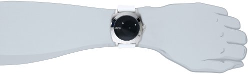 Casual watch, Japanese quartz movement, Matte white dot hour marker, Glossy black baton markers, Glossy white square marks passing of minutes, Matte black dial with black spinning disc and glossy red logo at nine o'clock position, Thick matte white silicone strap with brushed silver-tone brass buckle, Polished silver-tone brass bezel, Brushed/polished silver-tone brass cushion-shaped case, Textured steel crown with engraved logo, Stainless steel caseback, Mineral crystal, 3 ATM (30 meters/100 feet water resistant)Feature