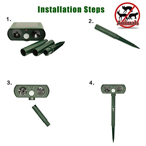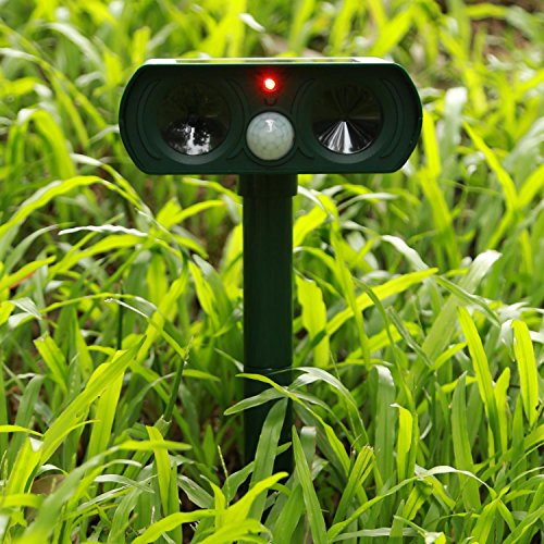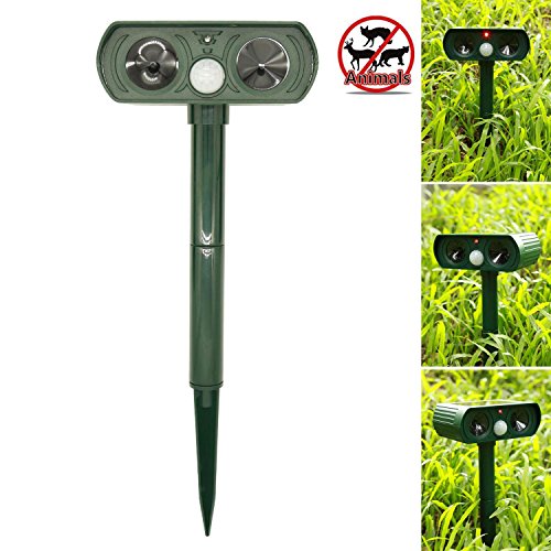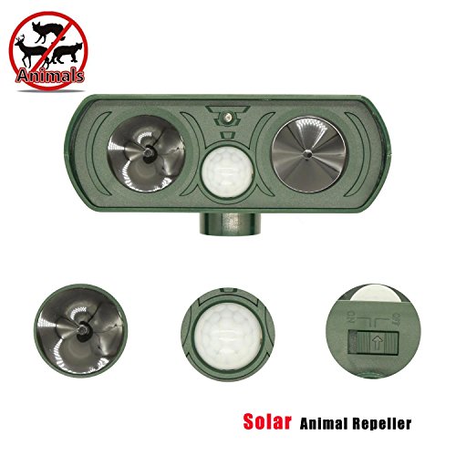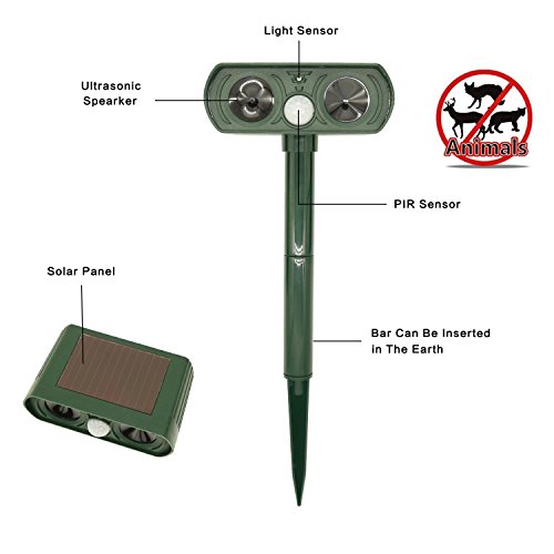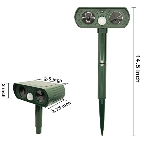 FUNCTION: Scare away the cats and other animal intruders such as dogs, squirrels, raccoons, rats or mice, etc. by emitting powerful ultrasonic and flashing LED lights When the Infrared PIR motion sensor detect them.
