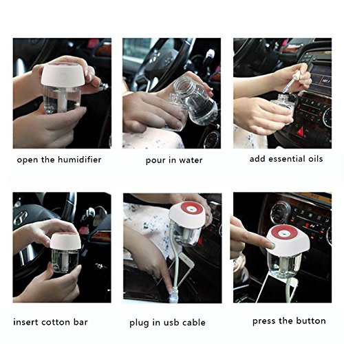- USB Port & Vehicle Cup Holder Design: Plug in your car, it is portable to be taken anywhere and fits perfectly to any vehicle cup holder. ( Package comes with only USB cable, no adapter included)Add a drop of your favorite essential oil to give your room and your car a pleasant scent.