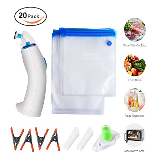 Nelipo Reusable Vacuum Sealed Bags - 20 BPA Food Vacuum Sealed Bags, with 1 Electric Pump, 2 Bag Sealing Clips and 4 Sous Vide Clips, Practical for Food Storage & Cooking