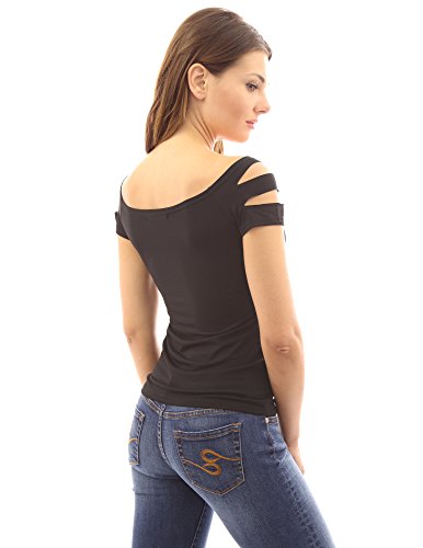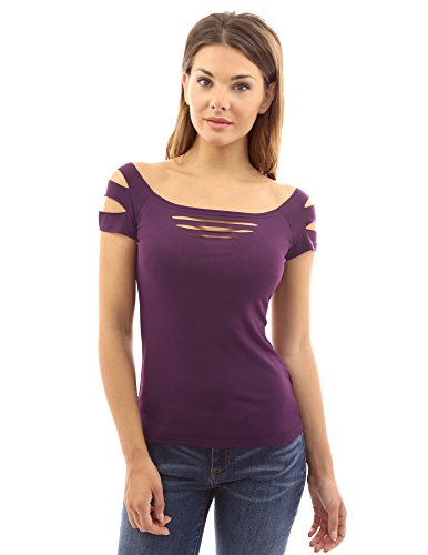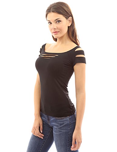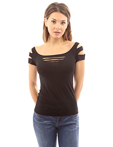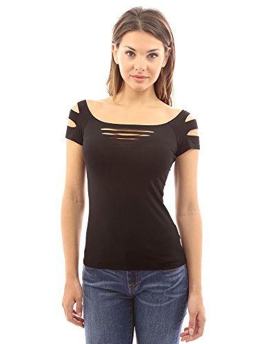 Sexy Slashed Ripped Cut Out Cap Sleeve Stretch Clubwear Party Blouse Top. Model in pictures is 5 feet 8 inches (173cm) tall.