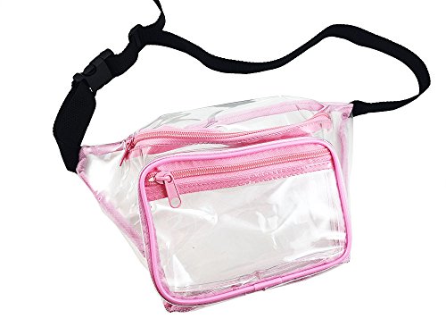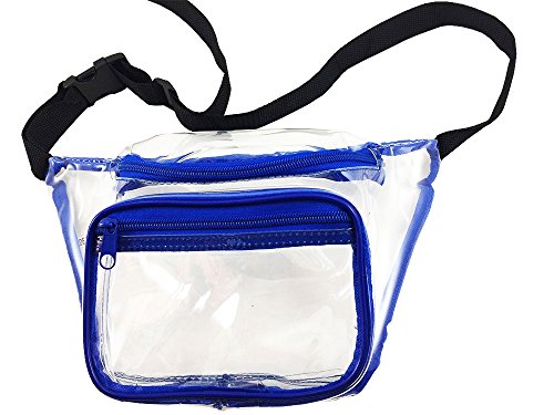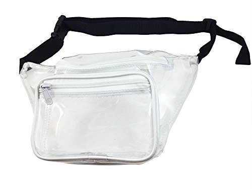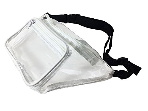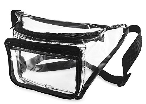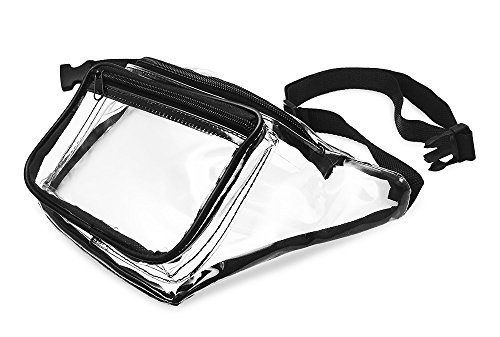 -. Feature : TOTALLY HIP - In case you missed it fanny packs are back. This transparent waist bag is compliant with clear bag regulations. / HANDS FREE - You can wear this clear stadium bag while keeping your hands full of hot dogs and beer at your next NFL football game. Approved size measures 12x6x3. / WATERPROOF - You will love how this plastic bag with strong fabric stitching repels water and keeps your things dry. / FASHIONABLE - 2 Zipper Design holds your phone, wallet, game tickets, makeup, brush, and sun screen. Black trim adds a nice accent. / ONE SIZE FITS MOST - Adjustable strap will fit any sized waist from child to adult 49 inches. Clearly your best choice of small clear bags.