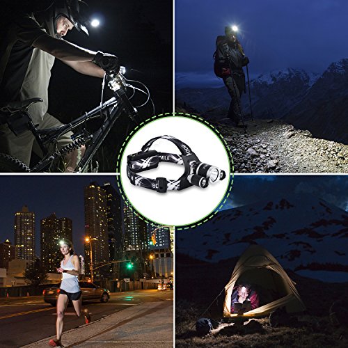 Specification Light Source: LED XM-L2 (middle), LED XP-G R5*2 (two sides) Working Voltage: 2.5- 4.2V Brightness: 2400LM Battery: 18650 Li-ion Battery Battery Capacity: 2 * 2200Mah Certification: CE/UL/FCC/SGS Charging Time: 7-8 hours Lamp Power: 20W Beam Angle: 120 degrees Shell Material: ABS Gross Weight: 15.6oz Service Life: 100,000 hrs Waterproof Rating: IPX5 Modes of Light: 4 (1L2 light in the middle, 2R5 light in two sides, 1L2 2R5 all light, Strobe) 0