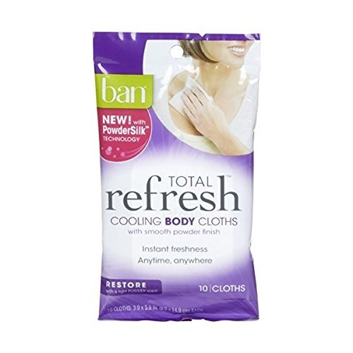 -. Feature : New! With PowderSilk technology. Cooling body cloths with smooth powder finish. / These revolutionary cloths, with patented PowderSlik Technology leave skin feeling soft and refreshed with a translucent, superfine powder so skin stays smooth and comfortable all day with no sticky residue. / Lightly-fragranced cloths cool skin on contact as they wipe away sweat for long-lasting freshness. / A convenient way to feel instantly refreshed anytime, anywhere. Gently wipe the soft, durable cloth on any part of your body - around your neck, chest or under arms / Great for after exercising, at work, before appointments, and on the road.
