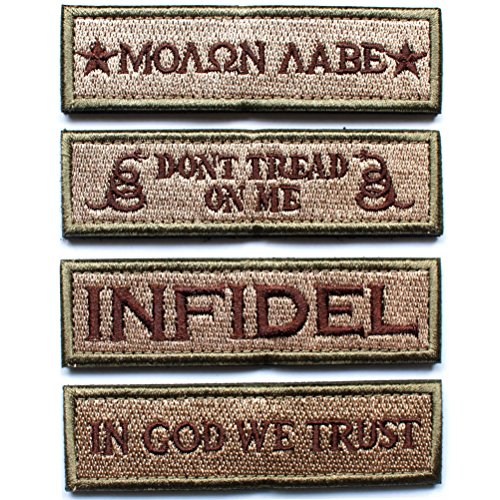 -. Title : 4 pcs Tactical Velcro Patch Set - In GOD We Trust, Don't Tread on Me, Molon Labe, Infidel Moral Decorative Embroidered Badge appliques