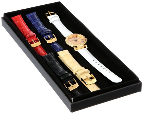 -. Feature : Japanese quartz movement / Mineral crystal; 18k gold ion-plated stainless steel case; white leather strap / Black second hand / Champagne dial with black and white hands and black roman numerals; luminous; 4 additional leather interchangeable straps included; special edition / Water resistant to 165 feet (50 M): suitable for swimming and showering