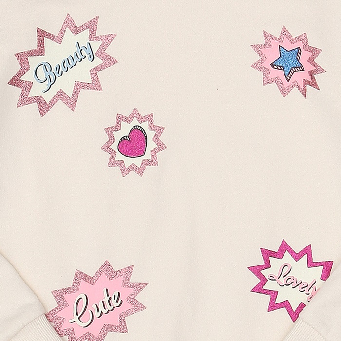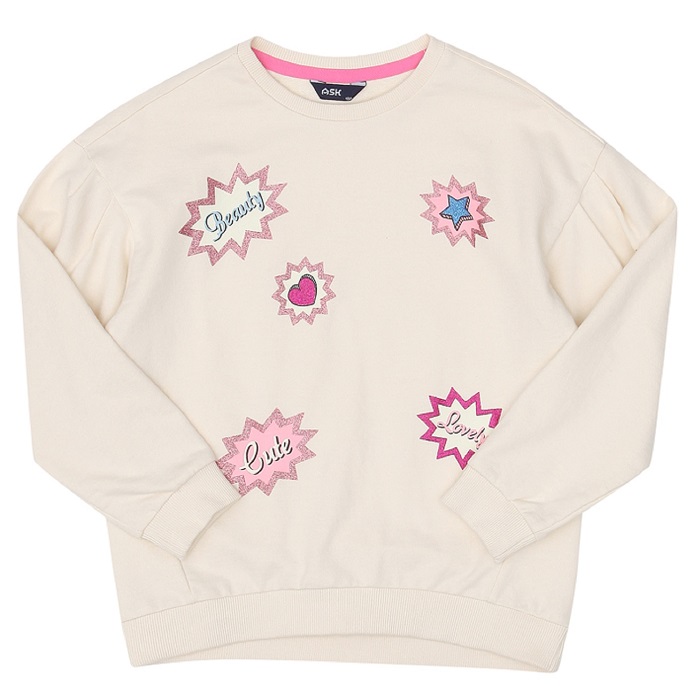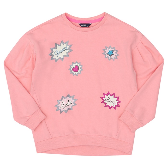 *글리터 나염과 소매 퍼프스타일로 포인트를 준 여아 변형 오버핏 맨투맨티셔츠입니다.