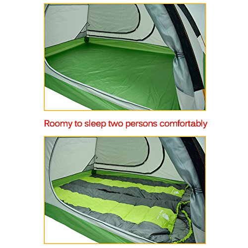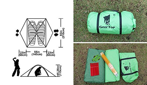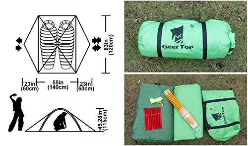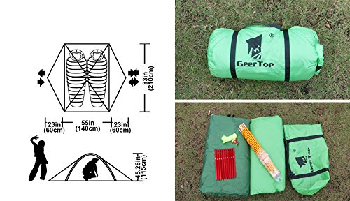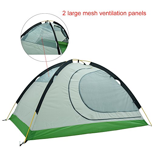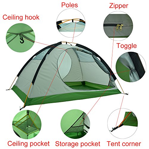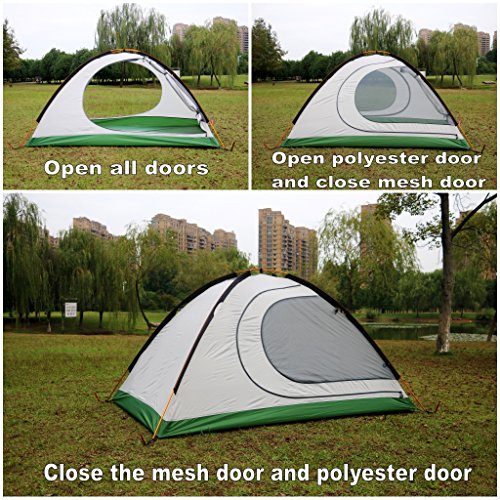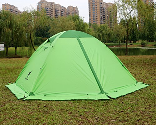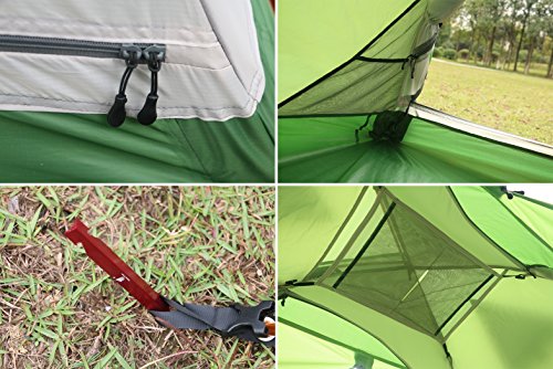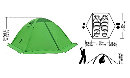 Features: 1. The double-layer, cross aluminum pole design and through-bar design, increasing the STABILITY of tent, makes the tent able to prevent chaos in the gale wind, able to be used in HARSH WEATHER CONDITIONS! ANTI-RAIN, ANTI-SNOW, ANTI- SEDIMENT. 2. The outskirts and inner tent with semi-mesh structure, enhancing the THERMAL PERFORMANCE, make the tent can be used in 4 SEASONS. 3. The tent have four corners with rain cover, door pack belts and guide ropes using reflective material for NIGHT USE. 4. Waterproof DOUBLE STITCHING SEAM TAPE to prevent big storm. The ALUMINUM TENT PEGS, lightweight and strong, not easy to rust.