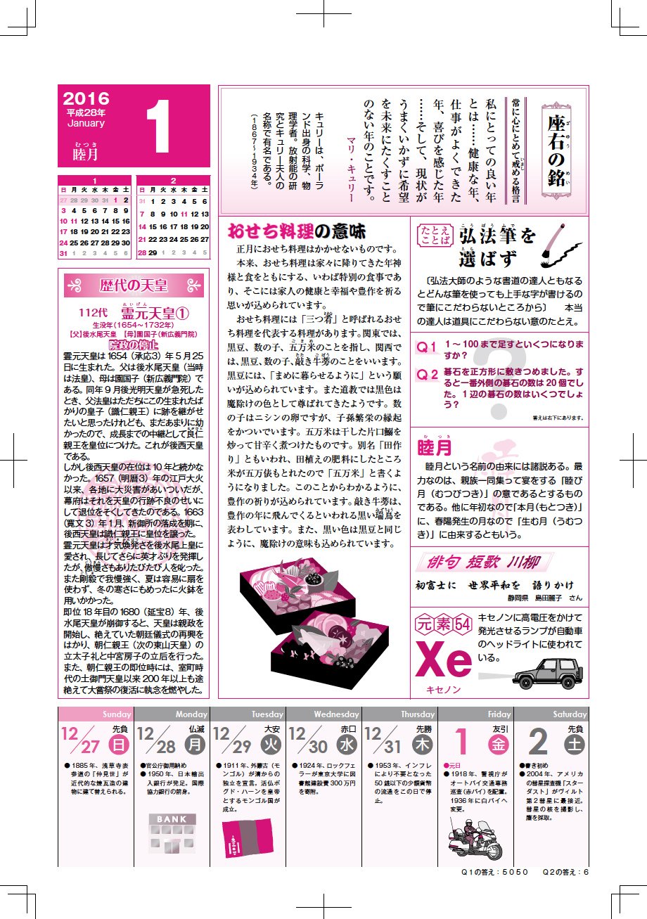 While I am sitting in a toilet, I buy it every year because I can learn sundry and family members so that my family can communicate. The composition of this time follows the 2015 version. On the left side is the introduction of successive emperors, this is a complete version of the content that lasted three years, until the next Emperor finally comes to the emperor. The upper side is also the motto of a motto this year. The lower right also introduces elements. In the upper right, the proverb proverb changed to the four-character idiom. Although I have purchased it for several years, although the format was not decided at the beginning, in the last few years it has become a stable format. Although it does not have beautiful pictures, it costs about 2000 yen, so it is expensive to say expensive, but it can be said that it is cheap because it can be enjoyed for one year.