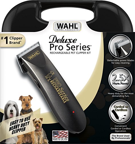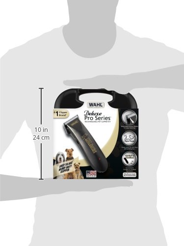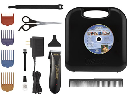 Studio : Wahl Publisher : Wahl Binding : Misc. Product Description Wahl deluxe pro-series rechargeable pet clipper kit. Includes rechargeable cord/cordless clipper, recharging unit, blade guard, handle storage case, oil, mirror, cleaning brush, scissors, medium comb, four comb guides - 1/8", 1/4", 3/8", 1/2". Instructional DVD. Self sharpening, high carbon steel blades are precision ground to stay sharp longer. Convenience of cord/cordless operation for full non-stop clipping power.. Limited 1 year warranty. 0