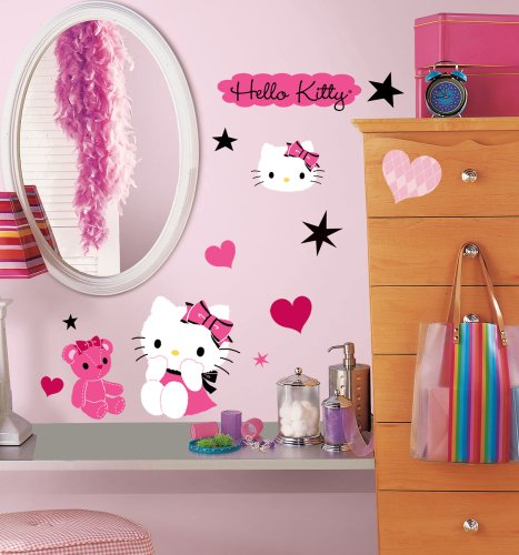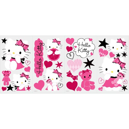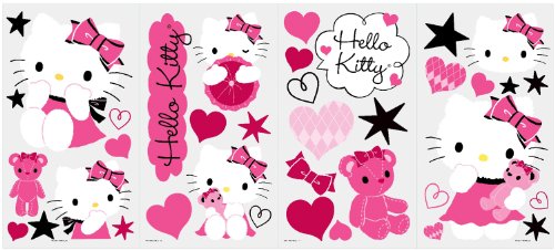 Get stylish with Hello Kitty! These sweet wall stickers are sure to please Hello Kitty fans of any age. Each set contains over 30 removable and repositionable wall decals, including hearts, bows, stars… and Kitty, of course! The decals can be applied to any smooth surface, including walls, doors, furniture, lockers and more. Try them in bedrooms, dorm rooms, playrooms, or wherever else your heart desires. You'll love how easy it is to transform any space with Hello Kitty!.Feature