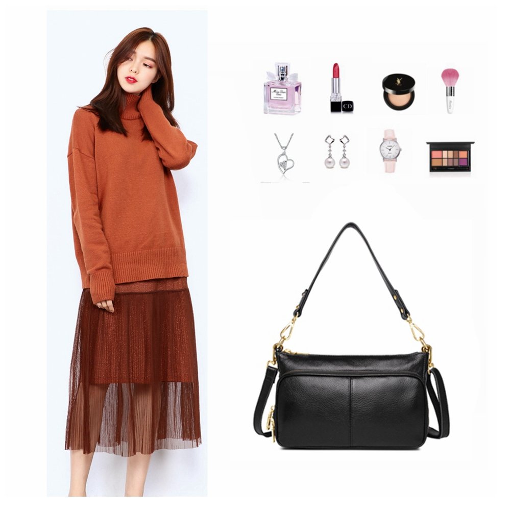 It is a real leather shoulder bag that has storage capacity more than it looks because it has a plump three-dimensional feeling.
