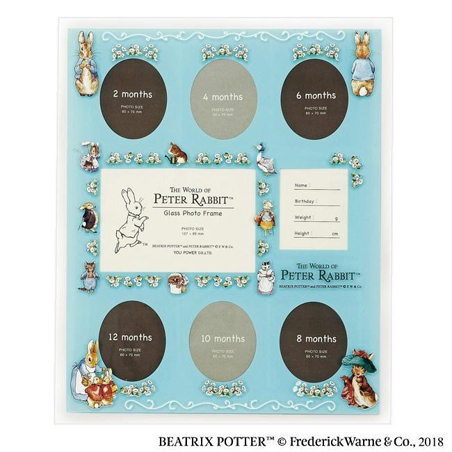 人気のピーターラビットをあしらった上品なフォトフレームです。2ケ月に1枚、1歳になるまでの写真を飾れます。イラスト入りの化粧箱なので、プレゼントにもおすすめ! |