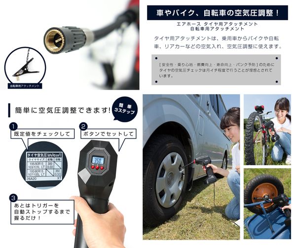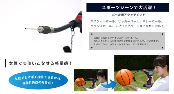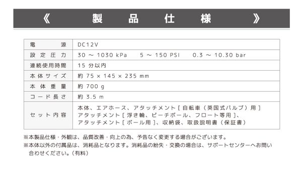 ●セット内容:本体、エアホース、アタッチメント[自転車(英国式バルブ)用]、アタッチメント[浮き輪、ビーチボール」、フロート等用]、アタッチメント[ボール用]、収納袋、取扱説明書(保証書)