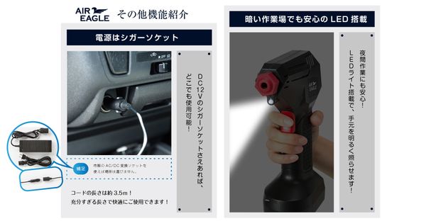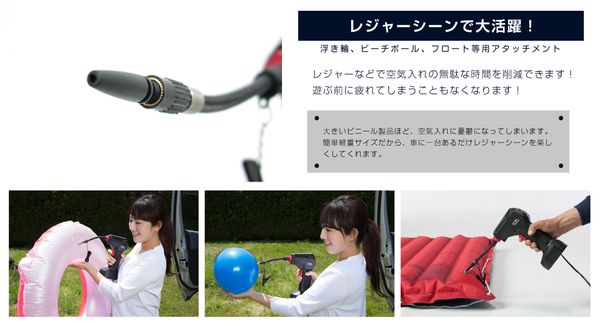 ●小型サイズのDCコンプレッサーです。今までは空気を入れるのに大きなコンプレッサーを使用したり口で膨らませたりと大変でした。本商品はコンパクトなので女性でも手軽にご使用いただけます。