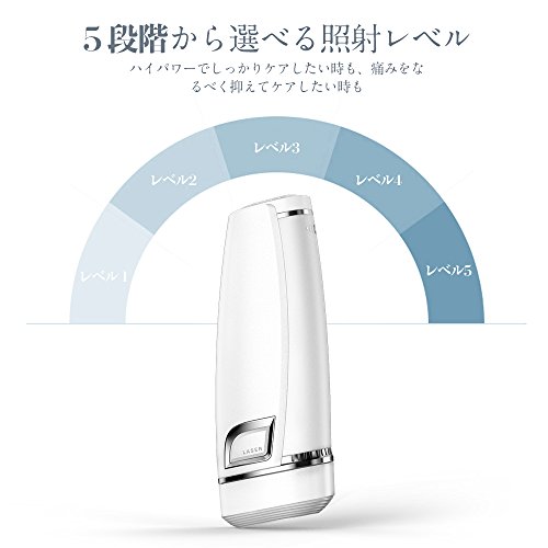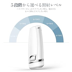 5、照射レベルを1~5まで調整可能、電源ボタンに軽押しとレベル調整です。脱毛するときは、必ず一番弱いエネルギーレベルから始めてください。脱毛中は不快感がなければ、次回のお手入れの際に表示ライト1つ分だけレベルを上げてください。その後、次のレベルに上げる場合も同様です。