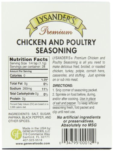 -. Feature : All natural ingredients, a select blend of herbs and spices created especially for chicken and poultry, flavoring meat perfectly. Easy and convenient to use - just sP.R.Inkle on / Quality chicken and poultry deserve Lysander's premium seasonings / Florida