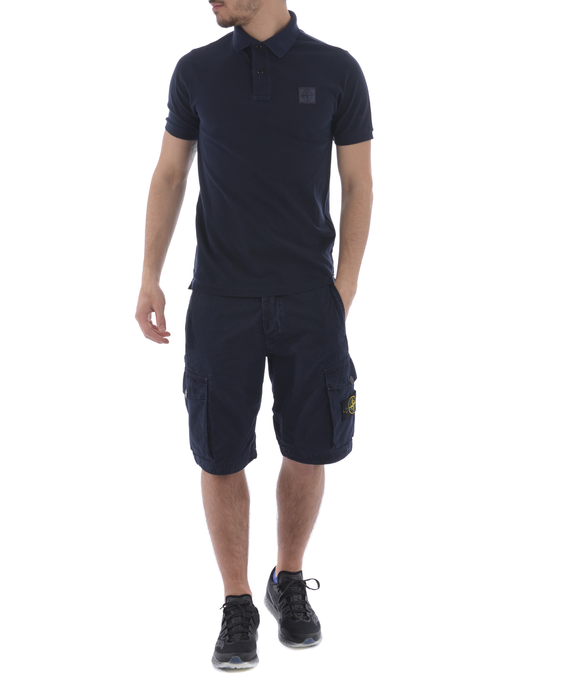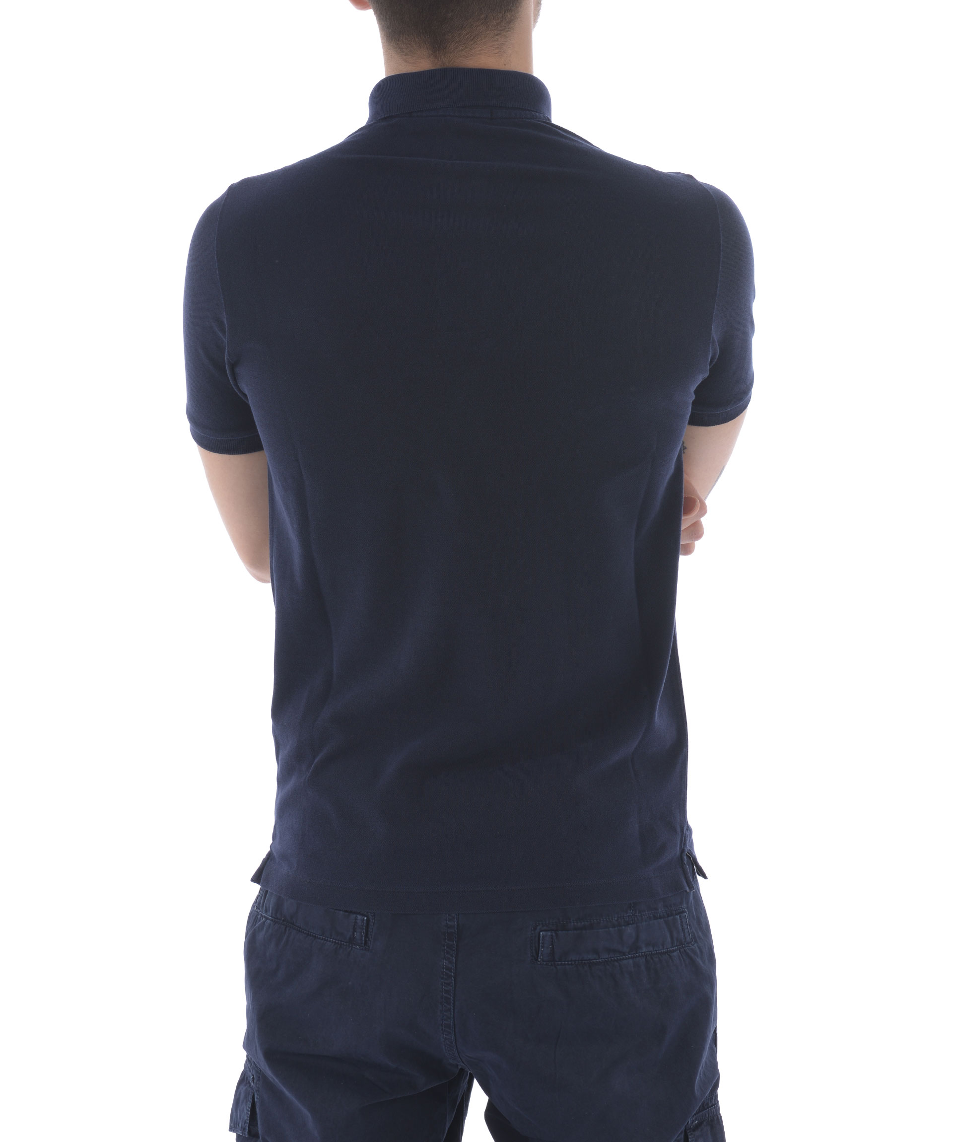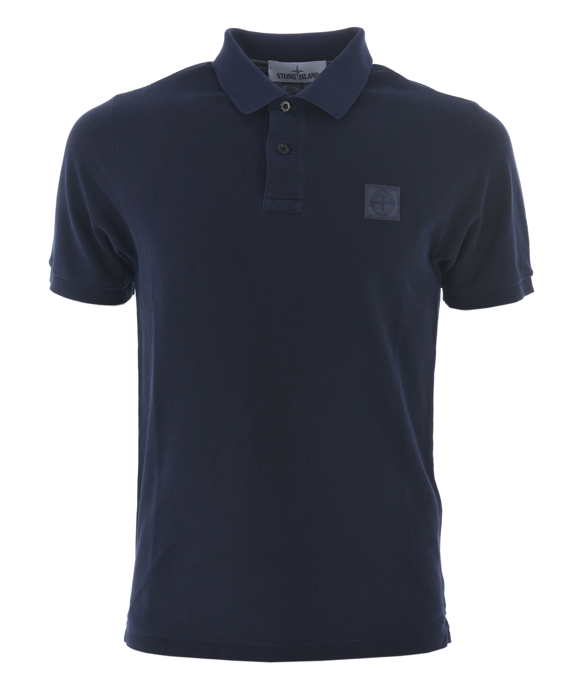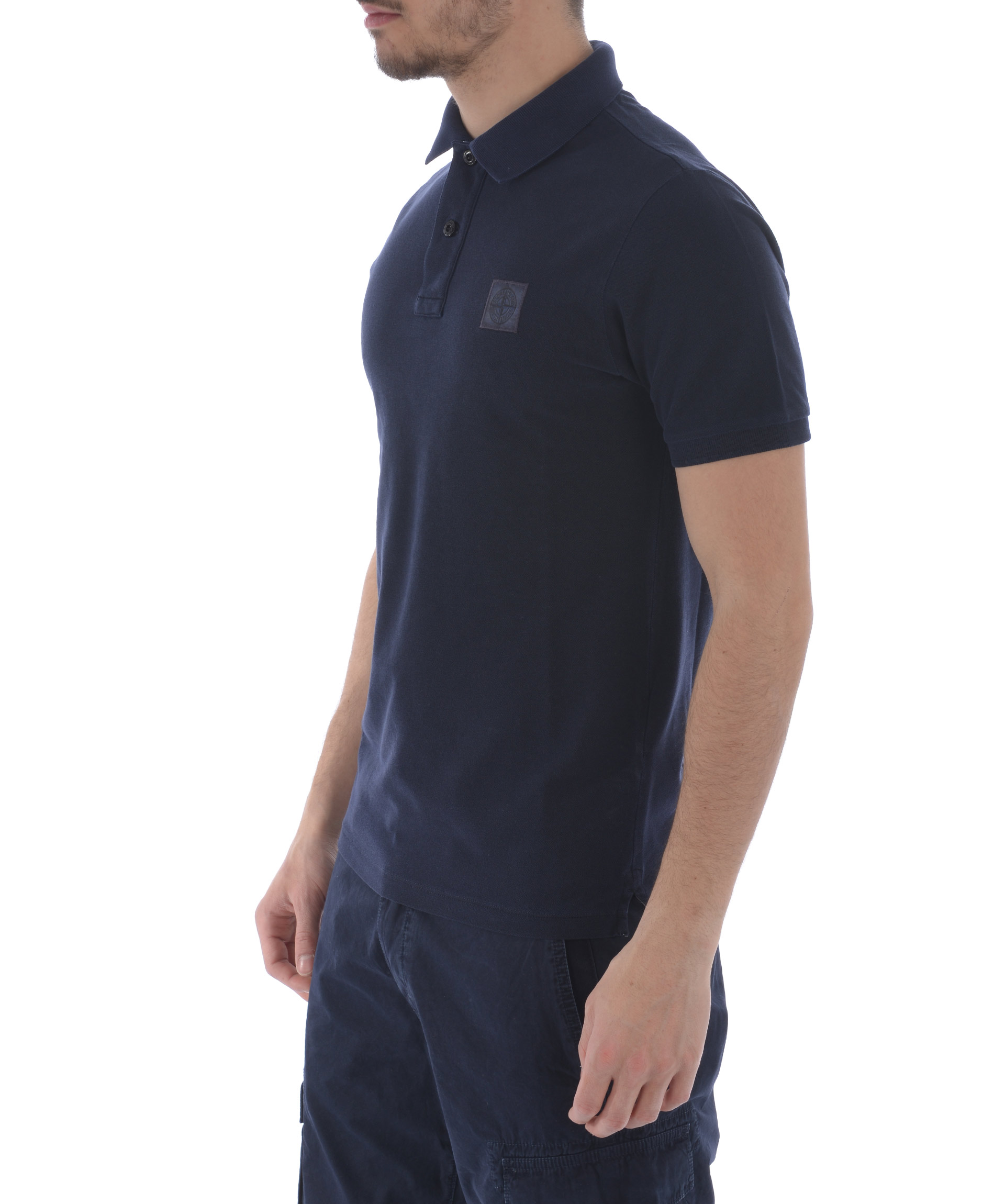 Polo Stone Island in piquet Blu scuro effetto delavè. Colletto a costine. Apertura a 2 bottoni. Manica corta con bordo a costine. Patch logo frontale. Slim fit. Misura in foto S 100% cotone