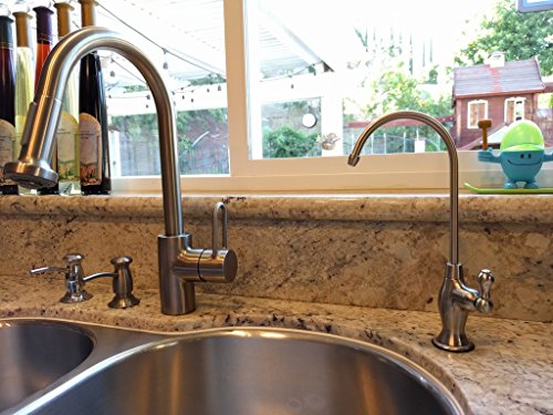 quarter-turn single lever with precise flow control and no-drip 360-degree swivel spout; lead-free solid brass and 304 stainless steel construction with long-lasting ceramic disk cartridge