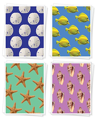 Seashore Assorted Blank Note Cards, Set of 8 Greeting Cards (2 each of 4 designs), Yellow Fish, Sand Dollar, Starfish, Seashells