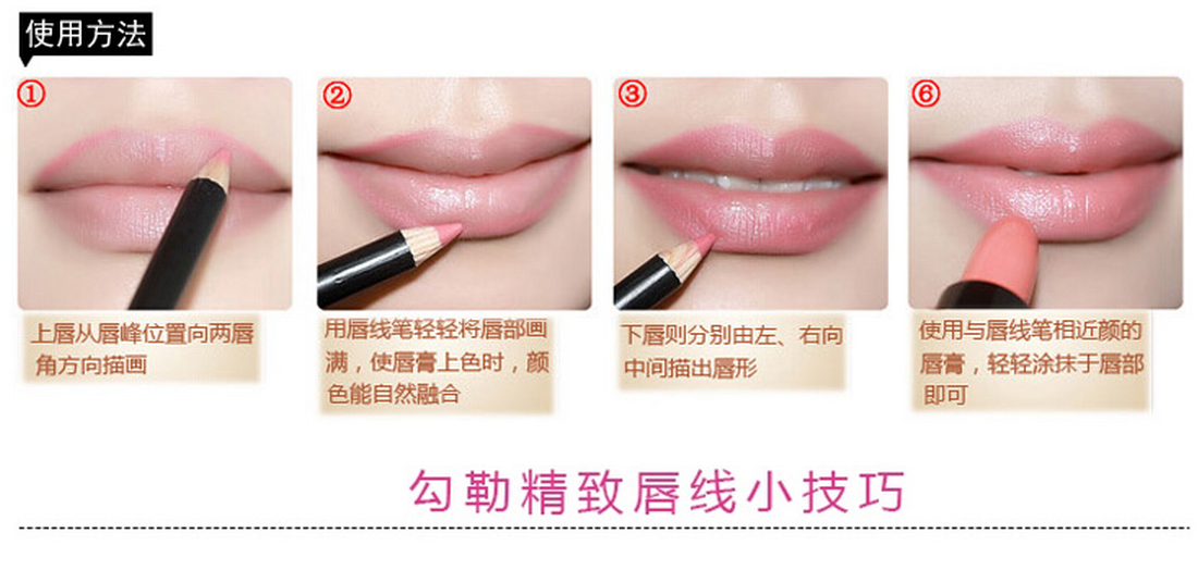 【使用方法】:选择与唇膏颜色相配的唇线笔,先描绘出上唇的唇峰,再以长而匀滑的笔触,由嘴角往中央描绘上、下唇的唇形,之后再涂唇膏。