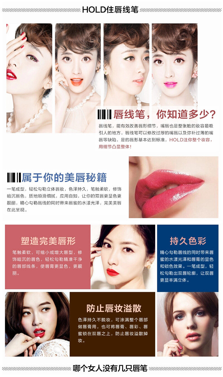 唇线笔用来勾勒唇形,让嘴巴的型更搭配妆容!随心而变!