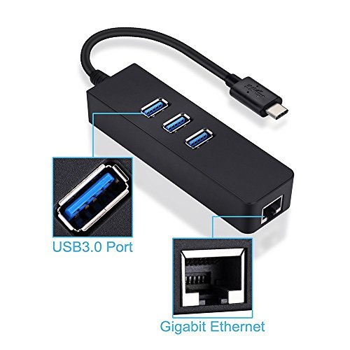 Rademax Type C USB 3.1 Hub to 3-Port USB 3.0 Hub with Gigabyte Ethernet Adapter for New 12 inch Macbook ChromeBook Pixel and Other Type-C Supported Devices(3-ports + Ethernet) (black)