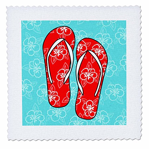 3dRose qs_77532_5 Cute Flip Flops Red Light Blue-Hawaiian Flower-Quilt Square, 14 by 14-Inch