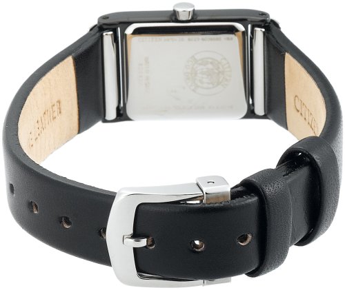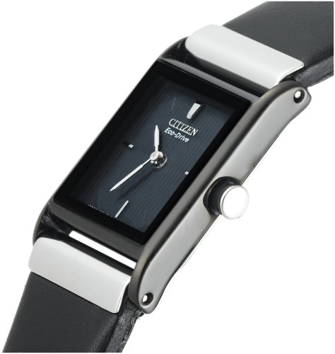 This ladies' Eco-Drive timepiece is powered by light, so it never needs a battery. The sleek, black timepiece will surely catch your eye with its' simple design. Features include a stainless steel case, three-hand function and black leather strap.Feature
