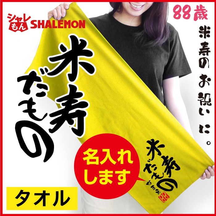 「米寿だもの」デザインが最高!シャレもんオリジナル米寿祝い用タオルです。もちろん高品質でしっかりとした厚手生地で実用性抜群です。名入れ可能ですので、プレゼントされる方のお名前を入れてみよう! サイズはフリーサイズ・一般的なタオルサイズです。 名前の文字は黒文字、書体は筆文字となります。文字数は8文字(ひらがな・カタカナ・漢字)まで名入れいたします。 他にもご長寿祝い商品が数十種ありますので、当店シャレもんの長寿祝いコーナーをご覧ください。きっと、笑顔になる還暦祝いはシャレもん!!
