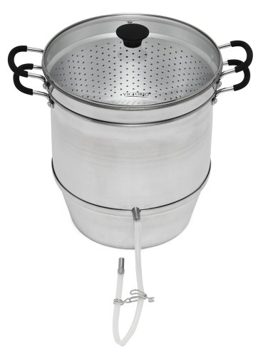 -. Feature : Three tiered system with durable extraction hose for extracting pulp-free juice from high liquid fruits and vegetables / Brushed aluminum pots and silicone coated handles / Colander holds up to 10 quarts and the juice kettle has a 4-1/2 quart capacity / Boiler pan has a 6 quart liquid capacity / 2 year warranty
